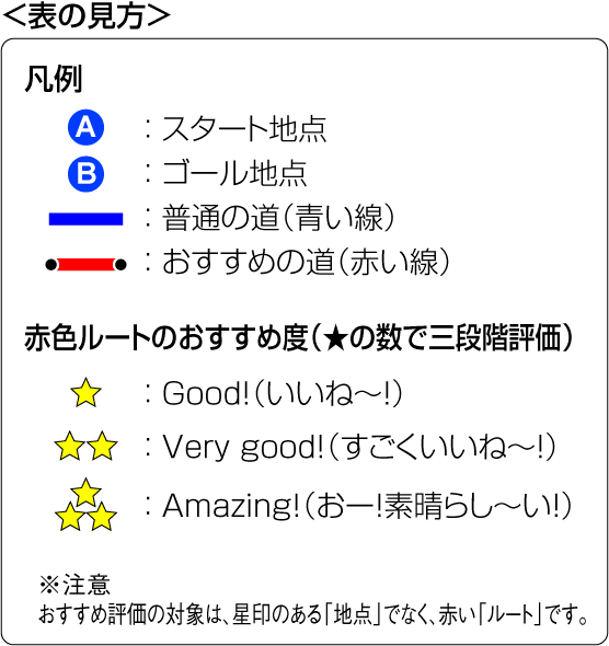 青いルートは普通の道、赤いルートがおすすめの道です。特に、赤ルートは★の数で三段階評価をしています。