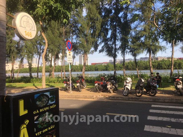 8区のNguyễn Thị Thập通りから南、Nguyễn Văn Linh通りまでの川沿いの通りは高級な邸宅が並ぶ落ち着いた静かなエリアになっています。はじめてバイクで通ったときは、ホーチミンシティでは珍しい雰囲気だと感じました。なんといってもその静かで涼しげな雰囲気を醸し出しているのはすぐ目の前をゆっくり流れる川 “Rạch Ông Lớn” です。この川沿いにはパラソルと簡易リクライニング椅子が並び、川を眺めながらコーヒーを楽しんでいる人が少なからずいます。