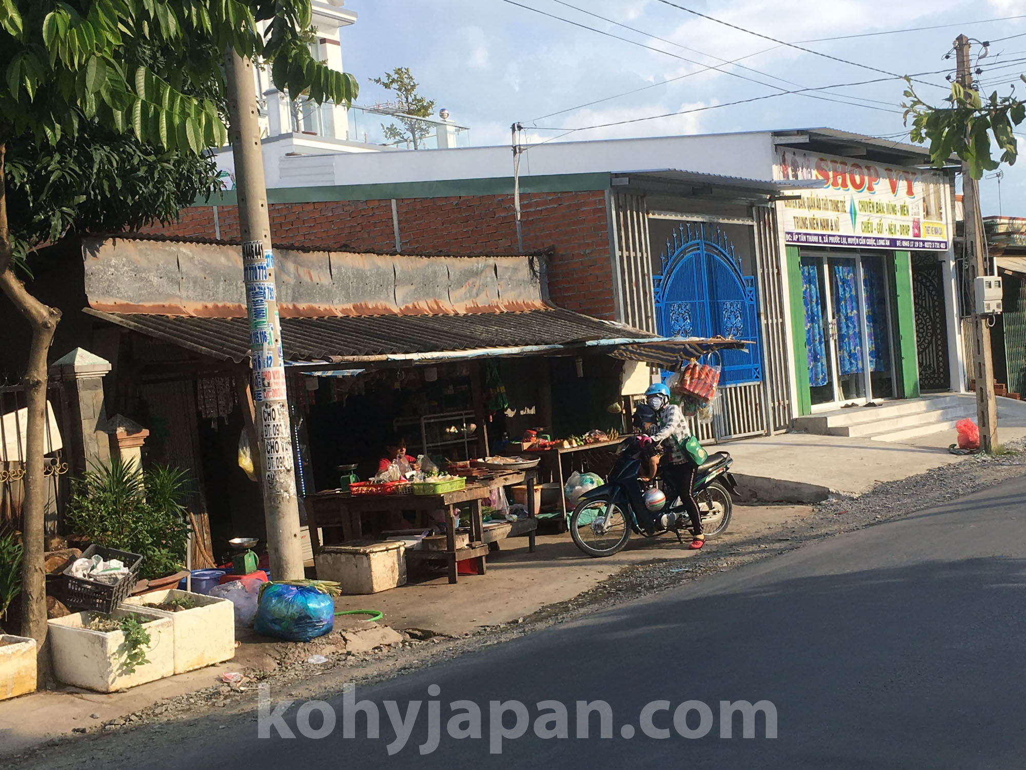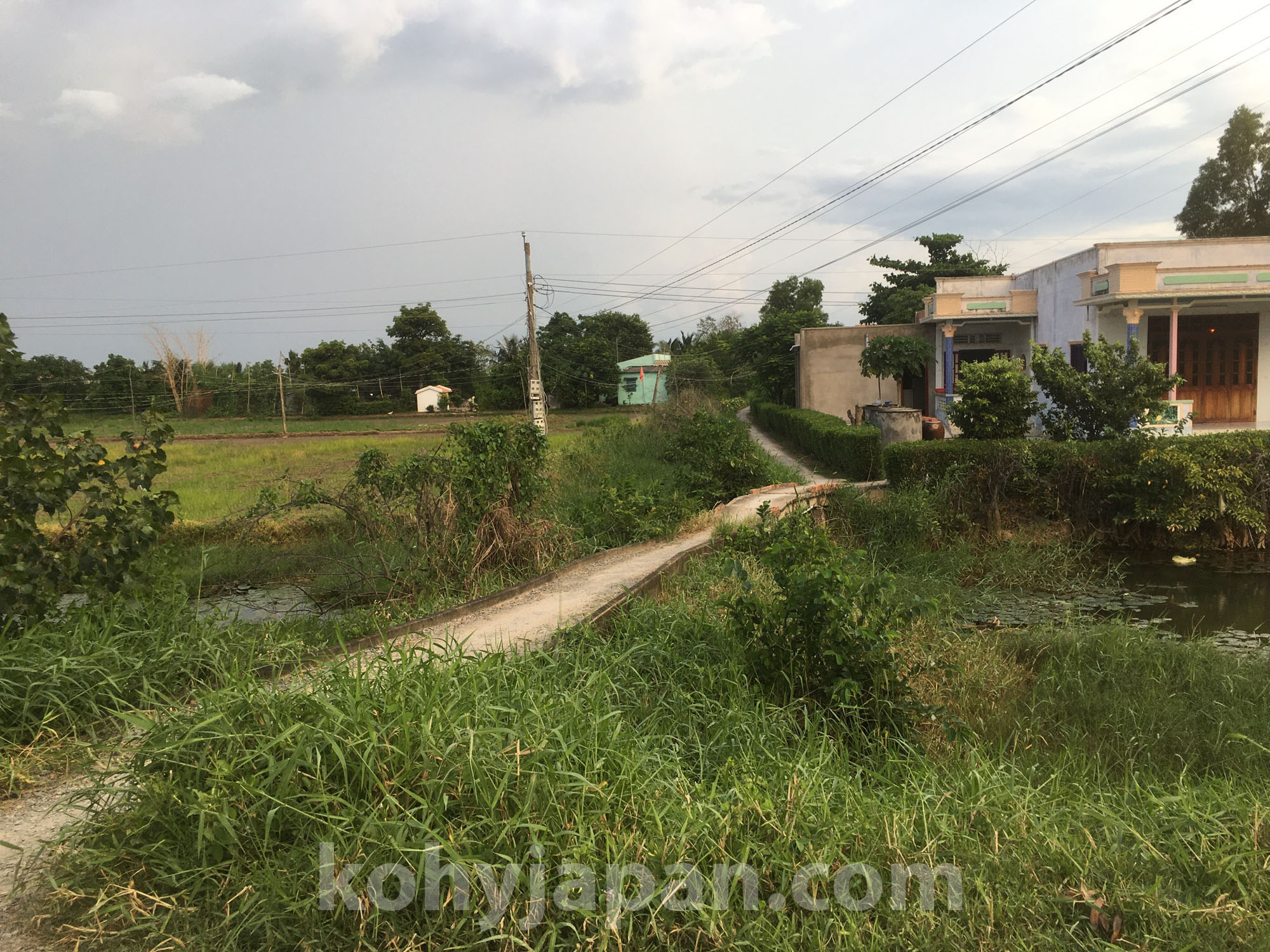 一見、サイゴンの街中に見られる道と同じようですが、基盤となるエリアがジャングルを切り開いた地域で、サイゴンとは異なることが家々の背景を見ると分かります。ジャングルの中にはベトナム語でrạch(英語でchannel)といわれる河が網目状に広がります。ちょっと日本語には訳しづらいですが、日本語では恐らくチャネル=水路となるのでしょうが、見た目はほとんど河です。このためにこの河を渡る橋が多いことも特徴です。話が少々ずれますが、ちなみに英語のcanal(恐らくベトナム語ではkênh)は人工の「運河」を意味し、この自然に形成された河の様な水路rạchとは異なります。前回はこのチャネルにかかる小さい橋を紹介しました。