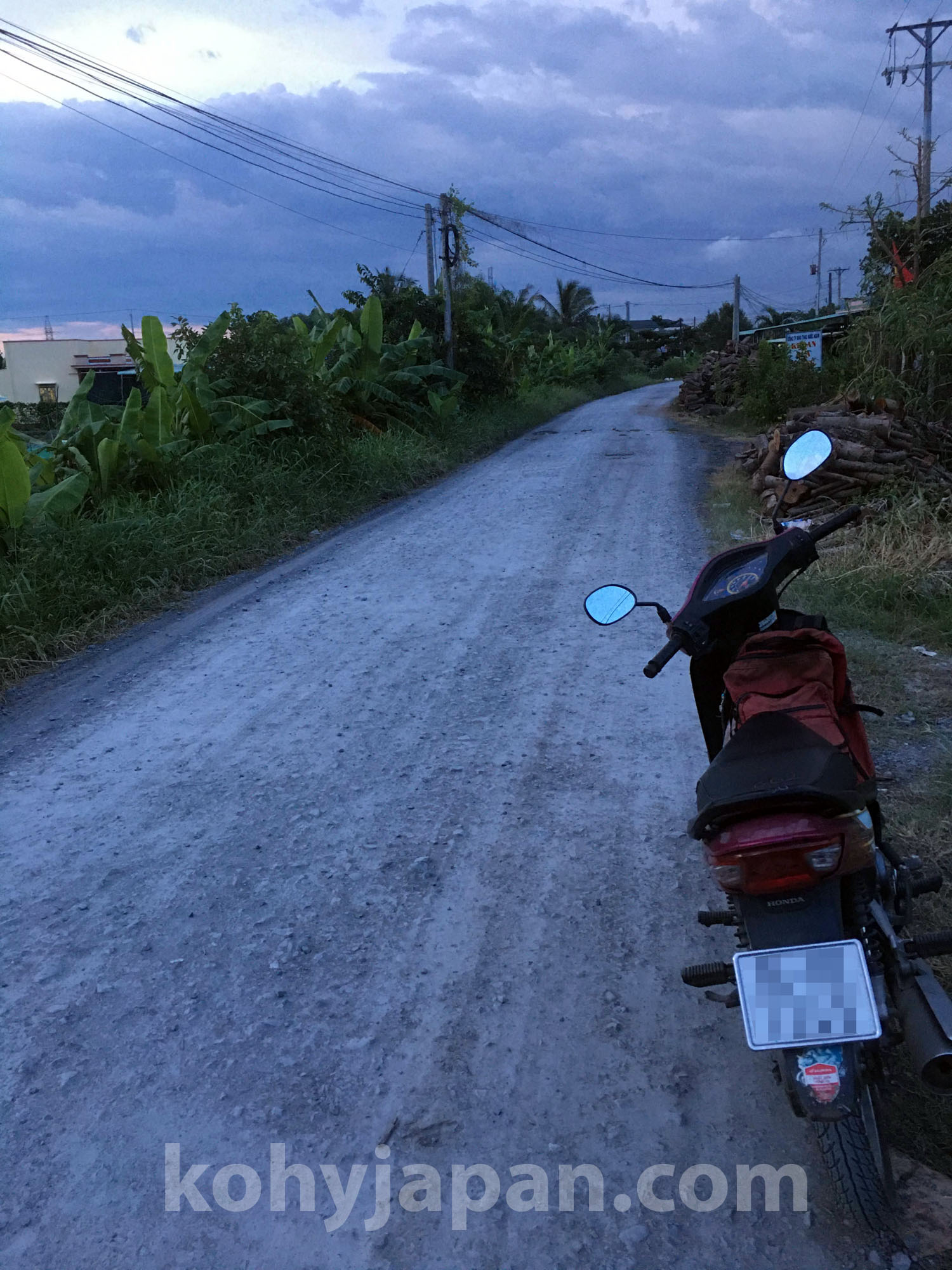 帰り道はCần Giuộc川(sông Cần Giuộc)の対岸で、ほとんど未舗装、名称も不明です。グーグルマップで拡大するとやっと出てくるほど細い道です。この道を走りだした時は少し薄暗くなっていたので本当に走れるのかかなり不安でしたが、走ってみると案外沿道に家もあり明かりがあり快適な道でした。