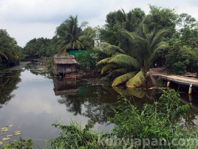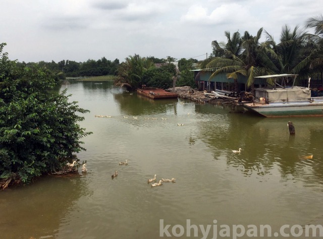 今回行ってみたNha Be川の対岸の地域もかなりの田舎、ホーチミンシティとは景色が全く異なる別世界です。Nha Be川の作った氾濫原であるこの地域は、大小のチャネル(天然の運河)が網目状に流れる広大なジャングルが広がり、その一部が民家や水田・果樹園などの耕作地に利用されています。後で触れますが、こんな開発には適さない地域でさえも現在、ベトナムの不動産高騰の影響を大きく受けています。