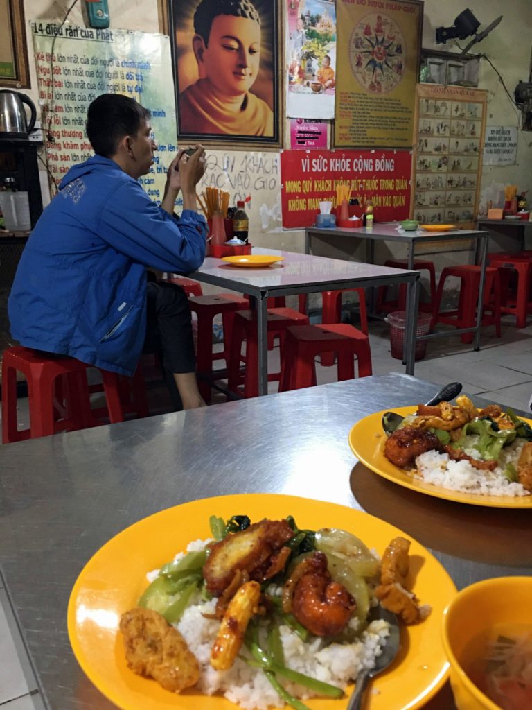 まずは皿にご飯をよそってもらい、その後自分で食べたい料理を選んでご飯の上に盛ってもらいます。肉や魚介類に見える料理がありますがすべて他の素材、主に大豆で作られています。ベトナムのベジタリアン料理店はよくできており、初めてこの手のお店に入ったとき、私はそれがベジタリアンのお店だという事を知らずに、食後に「これは肉じゃないよ」と言われて驚きました。言われないと気が付かないほど肉に酷似しています。幸運にもこの日偶然寄ったこのお店も例にもれずに非常においしかったです。ただ、このお店もそうなんですが少々味が濃いです。スープはよくあるトマトともやしが入ったすっぱあまい、料理と非常に合うスープです。これがまた旨い。これでたったの10,000ドン(約50円)、この日はとても幸福な気分になりました。実は私の経験ではベトナムのほとんどの食堂はおいしい、あまりはずれがないです。またぼるお店はたまにありますが、稀です。