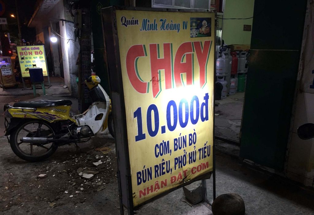 2021年の1月14日、この日は嫁が宗教上肉を食べない日*だというので、夕方によく行くベジタリアン料理屋に行ったのですが、あいにく閉まっており他のお店を探しましたがなかなか見つかりません。しょうがないので諦めて帰路についたのですが、その途中で偶然見つけたベジタリアン料理店がこのお店です。看板には値段が一皿10,000ドン(約50円)と書いてあります。ベトナムには無数に食堂がありますが、いきなり知らないお店に入るのは勇気が必要です。このときも、嫁はかなり躊躇していましたが、私が勇気を出して「よし、挑戦してみよう!」と背中を押してここで夕食をとることにしました。