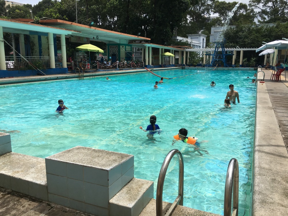 Lao Dongプールの概略は以前紹介しましたので説明が重複しますが、このプールの大きさは50m×15m(幅15mは目測)、深さは4m~0.8m、飛び込み台もありかなり本格的なプールです。