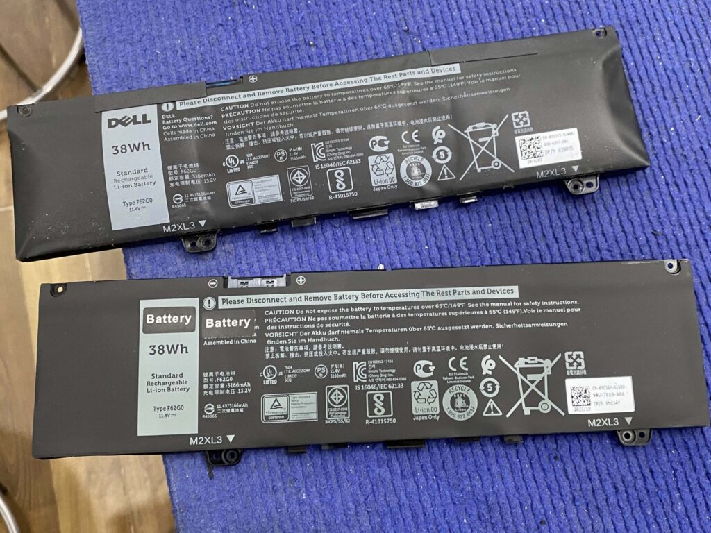 上が膨張した古いバッテリー。これの影響でパソコンが変形した。